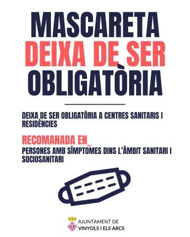 La mascareta deixa de ser obligatòria en centres sanitaris i residències per la baixada en la incidència de les infeccions respiratòries. Es recomana que les persones amb símptomes dins l’àmbit sanitari i sociosanitari la facin servir. Més informació a gen.cat/mascaretes