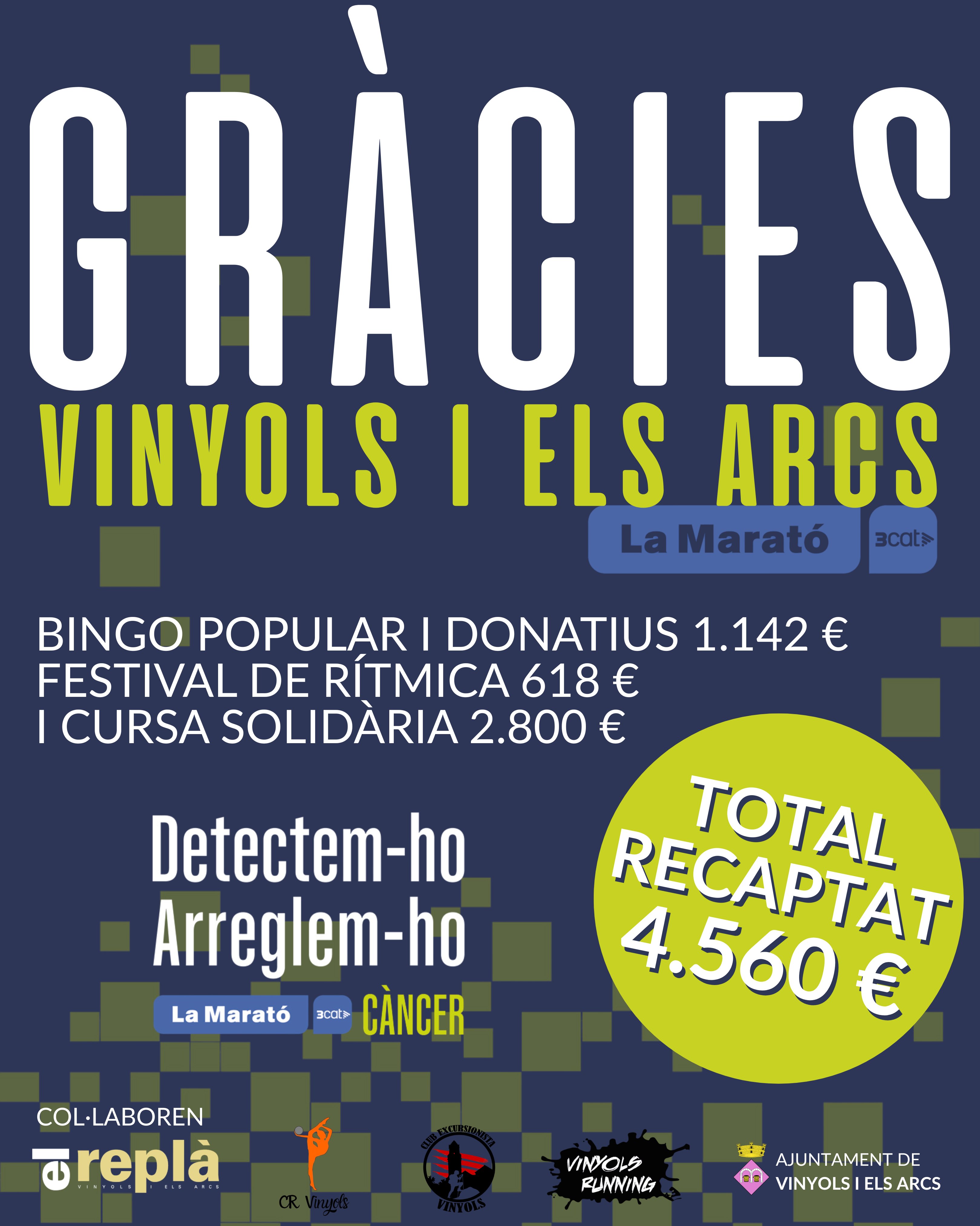 Diferents actes engloben la recaptació de la Marató de 3cat d’enguany a Vinyols i els Arcs: des del Bingo Solidari, passant per l’exhibició de gimnàstica rítmica i la I Cursa Solidària Vinyols i els Arcs.