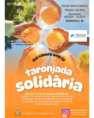 Ajuda'ns a fer més visible la lluita contra les malalties rares i impulsar la seva investigació La raresa té dret a l’esperança i, amb el teu gest, aportaràs el teu granet de sorra! Divendres 6 de març 16.30 h Escola Santa Caterina Obert a tothom! T’esperem per col·laborar amb la Taronjada...